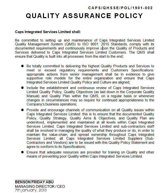 QUALITY ASSURANCE POLICY